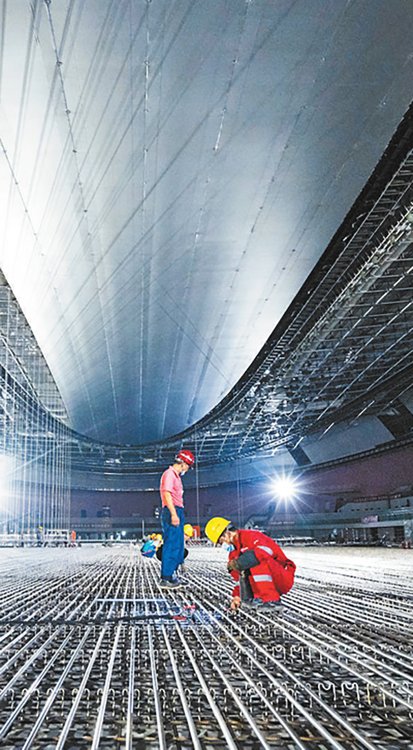 截至2020年底,北京冬奥会所有竞赛场馆已如期高质量完工。图为北京冰上场馆竣工前,工人们在施工。矫立月摄(影像中国)